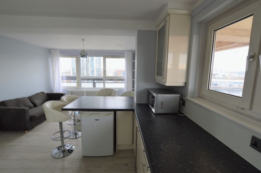 Open Plan Living Room And Bedroom - The kitchen cabinetry and island match the woodwork in the rest of the house.